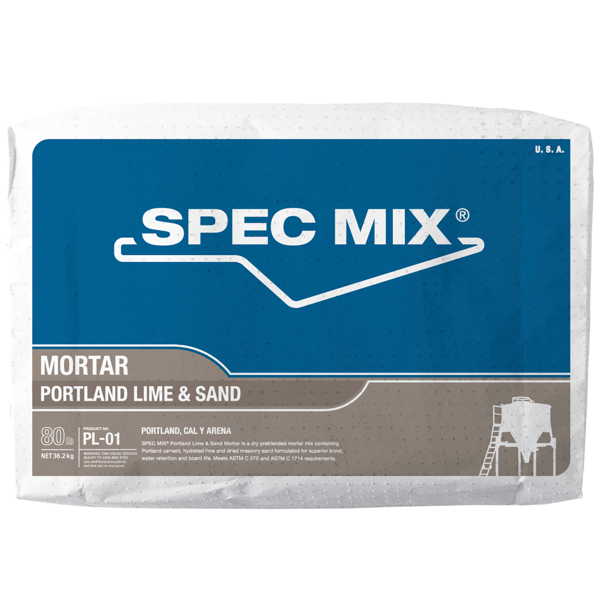 SPEC MIX® Portland Lime & Sand Mortar is a dry, preblended mix of portland cement, hydrated lime, and masonry sand, designed for superior bond, water retention, and board life. Available in Types M, S, and N, it meets ASTM C270, ASTM C1714, and CSA A179 standards and comes in standard or custom colors. Suitable for above- or below-grade masonry and compatible with most masonry units, custom mixes are also available for specialized applications. Produced under strict quality control, each batch comes with a digital record of proportions. Available in 80 lb bags or 3,000 lb bulk bags for silo systems.
