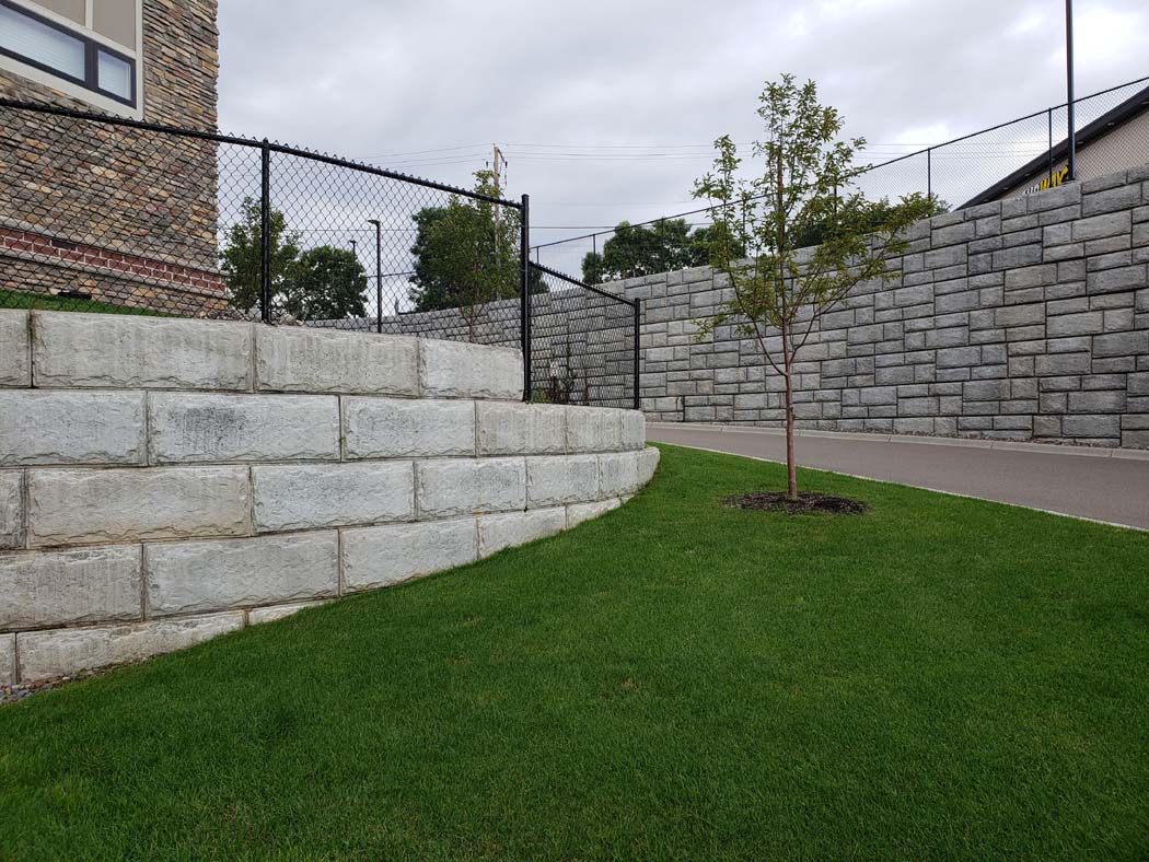 The Bronco 18H system comprises units of varying depths, half units, corner units, freestanding units, backfill caps and flat caps. Bronco 18H can be used for walls up to 15 feet tall without soil reinforcement, making it ideal for projects with excavation constraints. It easily accommodates geogrid, such as VERSA-Grid, for taller walls. With near vertical construction and variable bond, Bronco 18H is more versatile than other comparable products. After installation, the natural stone appearance of the Bronco 18H wall face can be enhanced with stain to blend into the natural environment.